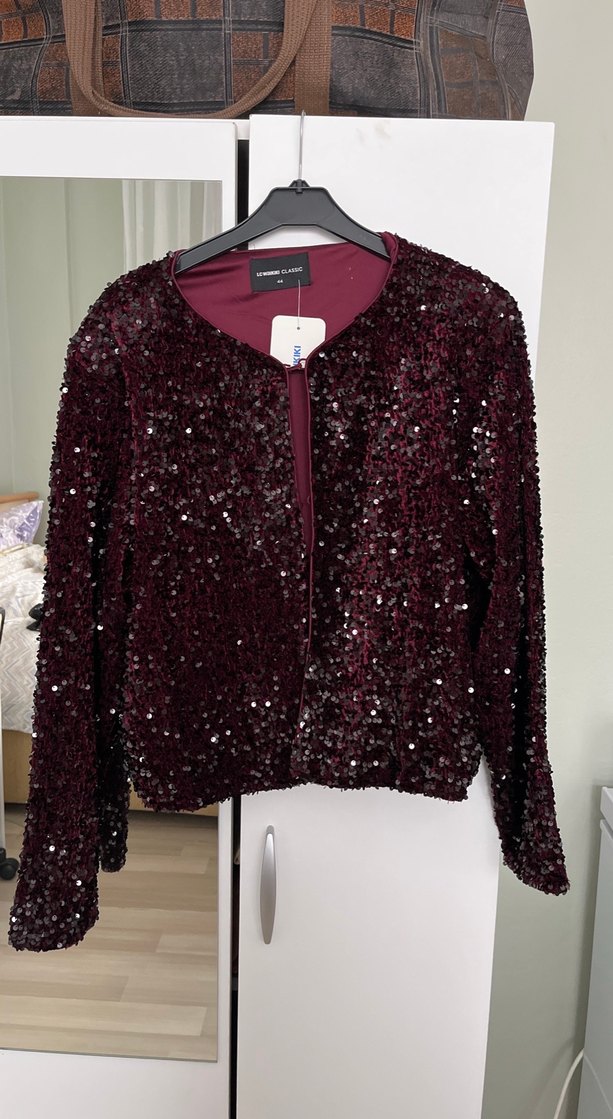 Bordo renk, payetlerle kaplı, uzun kollu, normal midi uzunlukta, dar kesim kadın ceketi. Notched lapel yakası ve sentetik kumaşı ile partiler için uygun şık bir modeldir. ✨ kadife üzerine payetli işlemeli