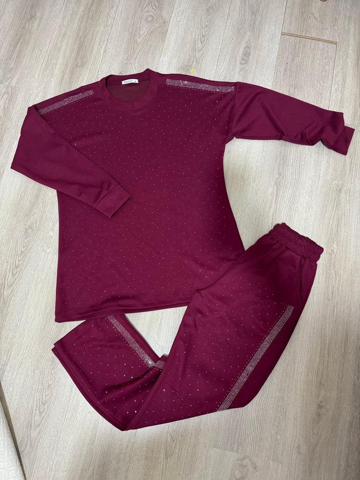 Bordo, bol kesim kadın eşofman takımı, uzun kollu ve yuvarlak yakalıdır. Payet detaylarıyla renkli ve rahat bir sokak stili sunar. ✨