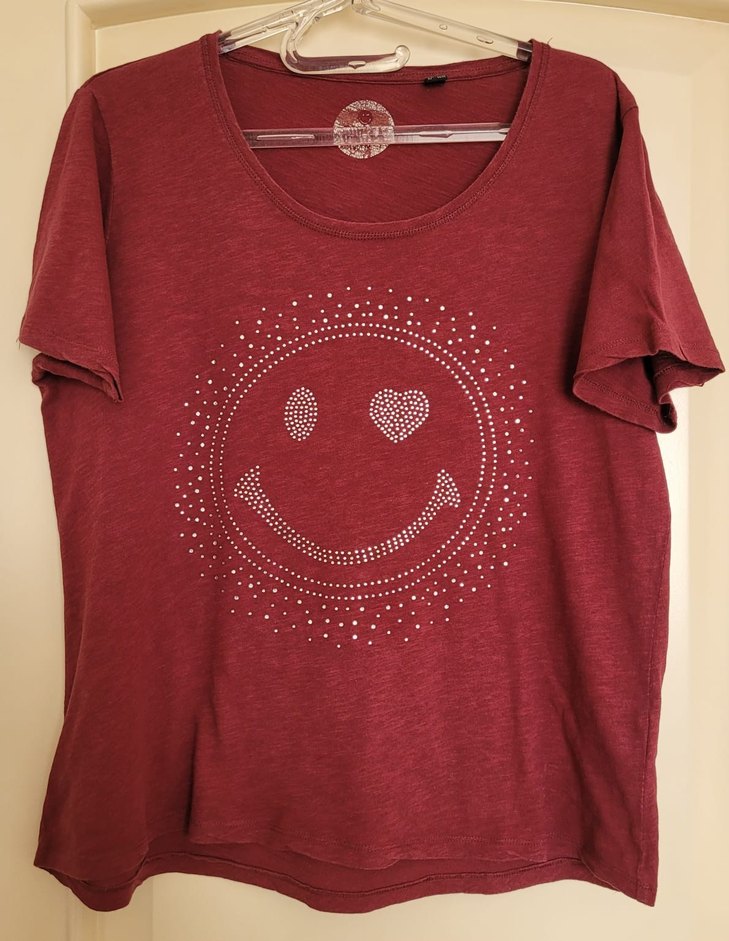 Bordo renk, kısa kollu, yuvarlak yakalı ve payetli gülen yüz baskılı tişört. Rahat kesimi ile günlük kullanıma uygun.Tchibo gülen yüz taş süslü, geniş, %100 cotton, salaş tshirt, koyu bordo renkli, herhangi bir solma vs yoktur, iki kol arası 60cm, boyu 64cm #tchibo #bordo #tshirt #smiley