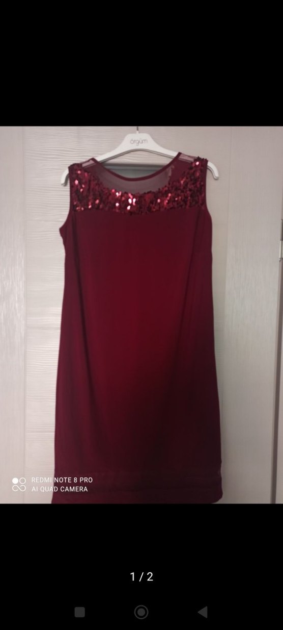 Bordo renk, kolsuz, mini uzunlukta, vücuda oturan ve straplez yakalı payetli abiye elbisedir. Parlak payet detaylarıyla şık bir görünüm sunar. ✨44 beden