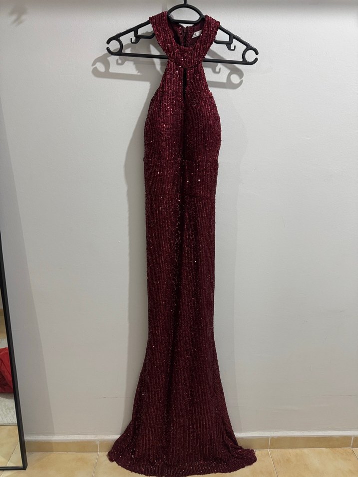 Bordo renkli, payetli esnek kumaşlı abiye elbise. Sıkı kesim, yüksek halter yaka ince göğüs dekolteli abiye. ✨