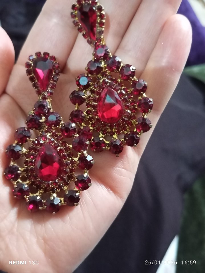 Uzun, desenli ve bordo payetlerle süslü bu küpeler, bohem tarzda gösterişli bir düğün görünümü için uygundur. sadece kinada takildi