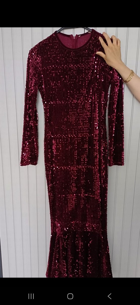 Bordo renkli, uzun kollu ve yuvarlak yakalı abiye elbise, tamamı payetlerle kaplıdır. Fitted kesimi ve uzun boyuyla partiler için uygundur.✨ Sadece 1 kez giyildi.
