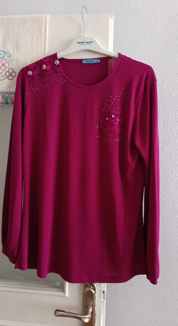 Bordo renkte, uzun kollu ve yuvarlak yakalı, yumuşak ipeksi kumaştan yapılmış bol kesim bluz. Parlak payet detayları ve baskılı deseniyle günlük sokak stiline uygun. ✨