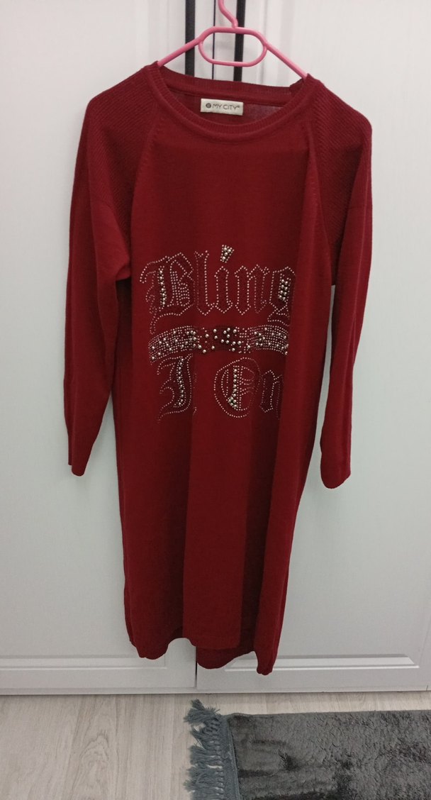 Bordo, uzun kollu, yuvarlak yakalı, bol kesim triko tunik. Parlak payetli baskı detaylı, rahat ve konforlu, günlük kullanıma uygun. ✨