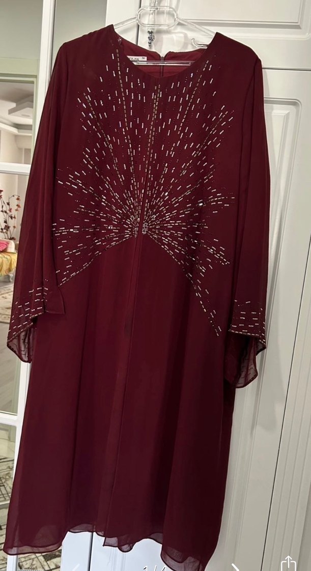 Beden 54 Bordo renkli, uzun kollu ve V yakalı, payetli işlemelerle süslenmiş bol kesim uzun elbise. Sentetik kumaş boyu 120 cm iki kol göğüs altı ölçüsü 60 cm astarlı iç göstermez iki kez tek kullanılmış sorunsuz oldukça şık özel tasarım