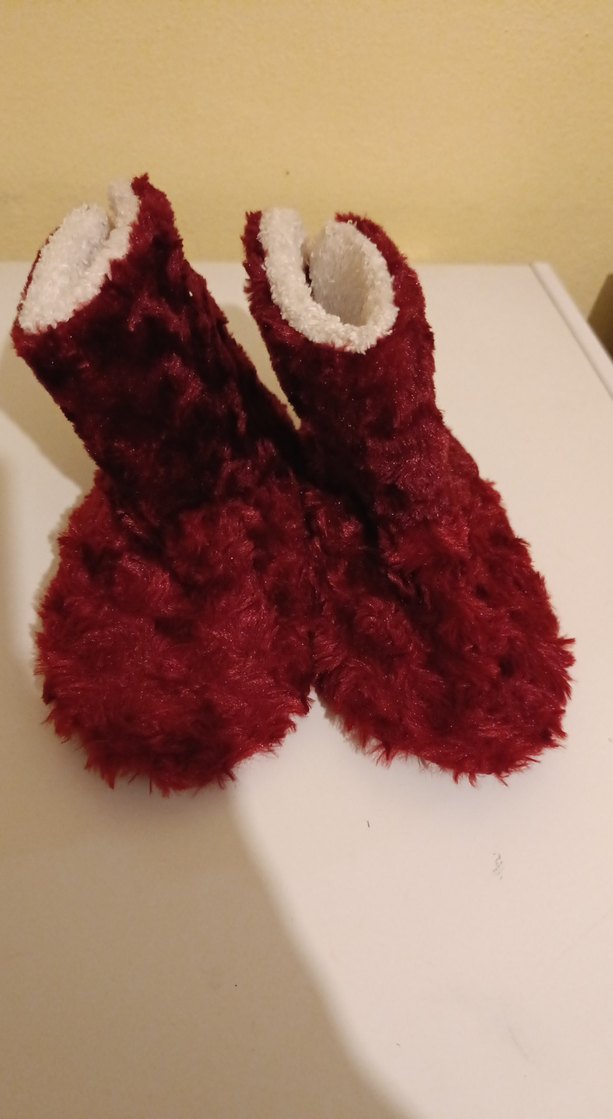 Bordo renkli, yumuşak peluş ve kürk detaylı kız çocuk ev botu, iç mekanlarda sıcaklık sağlar.