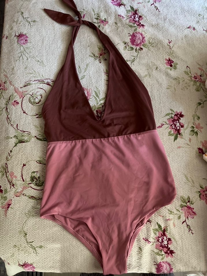 Bordo üst ve pembe alt kısmı ile askılı, bohem tarzda, normal boy mayo. Sahil için şık ve rahat bir seçenek.