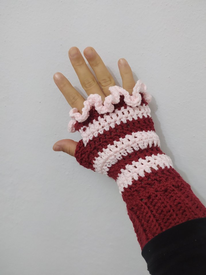 Bordo renkli örme eldivenler, pembe fırfır detaylarıyla bohem tarzda rahat ve renkli bir görünüm sunar. Son dönemlerin trendi olan bu ürün parmaksız tasarımlıdır. La Mia marka ip ile örülmüş asla tüylenme vs yapmaz, senelerce kullanabilirsiniz.
