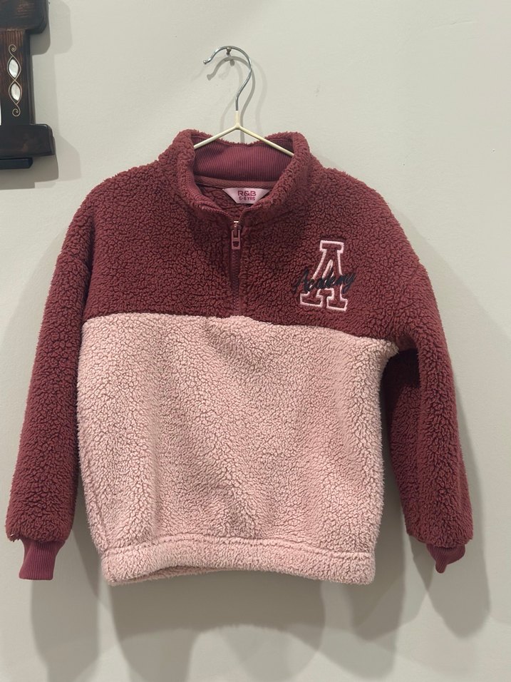 Bordo ve pastel pembe renklerde, nakış detaylı, yuvarlak yakalı, bol kesim kız çocuk peluş ceket. Yumuşak, sıcak kumaştan, kürk detaylıdır.