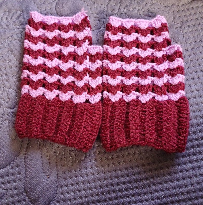 Bordo ve pembe renklerde, örgü dokulu, rahat ve bohem tarzda kadın parmaksız eldiven. Renkli ve yumuşak kumaşlıdır.