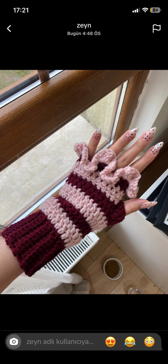 Bordo ve pastel pembe çizgili örgü parmakları açık eldivenler, rahat ve şık bir görünüm sunar.
