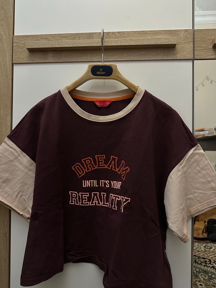 Bordo pamuklu tişört, bej kollar ve kemerli detaylıdır. Önünde "DREAM UNTIL IT'S YOUR REALITY" baskısı bulunmaktadır. Rahat kesim, günlük sokak stili için uygundur.