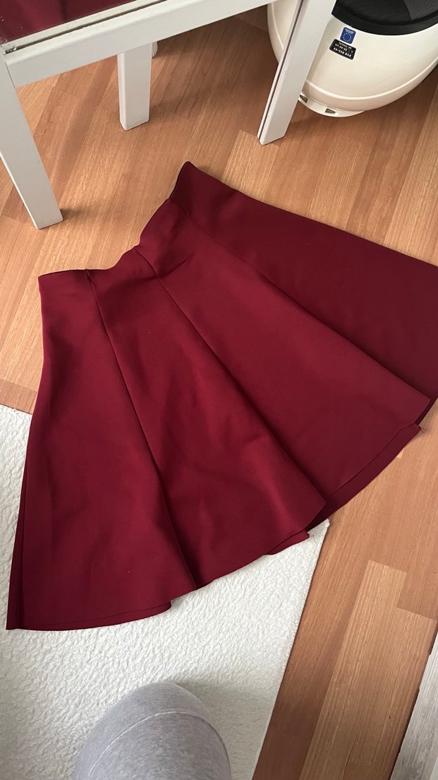 Bordo renkli, parlak sentetik kumaştan yapılmış, pileli ve bol kesim midi etek. Günlük kullanıma uygun, çağdaş minimalist tarzda.