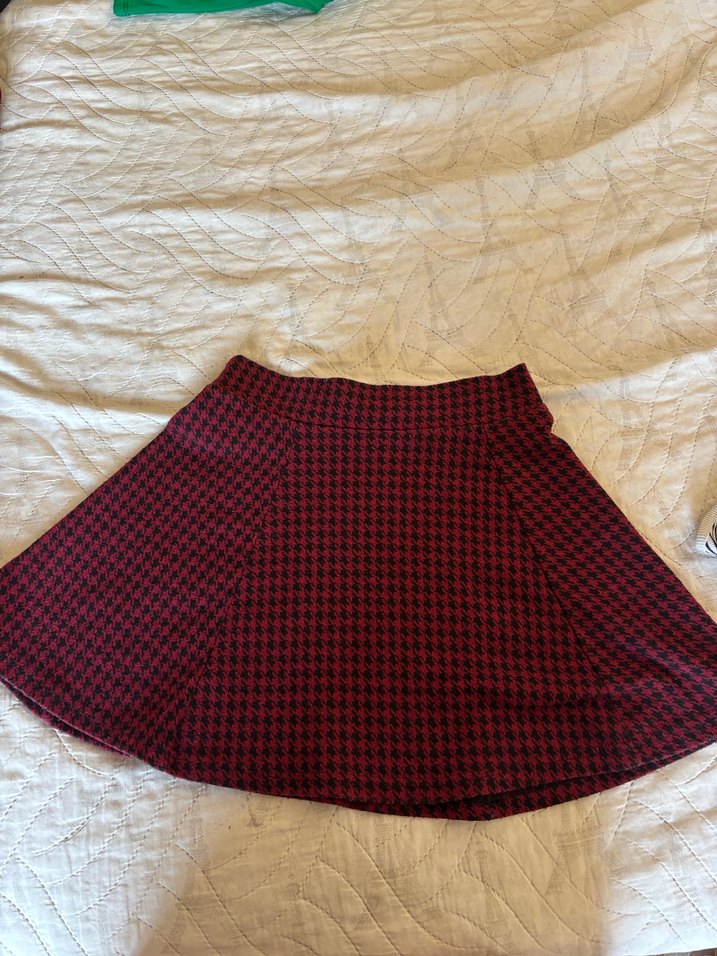 Bordo renkli, pileli ve vücuda oturan mini etek. Yumuşak ve rahat kumaştan, koyu tonlu ve karşı kültür tarzında, romantik akşamlar için uygun.