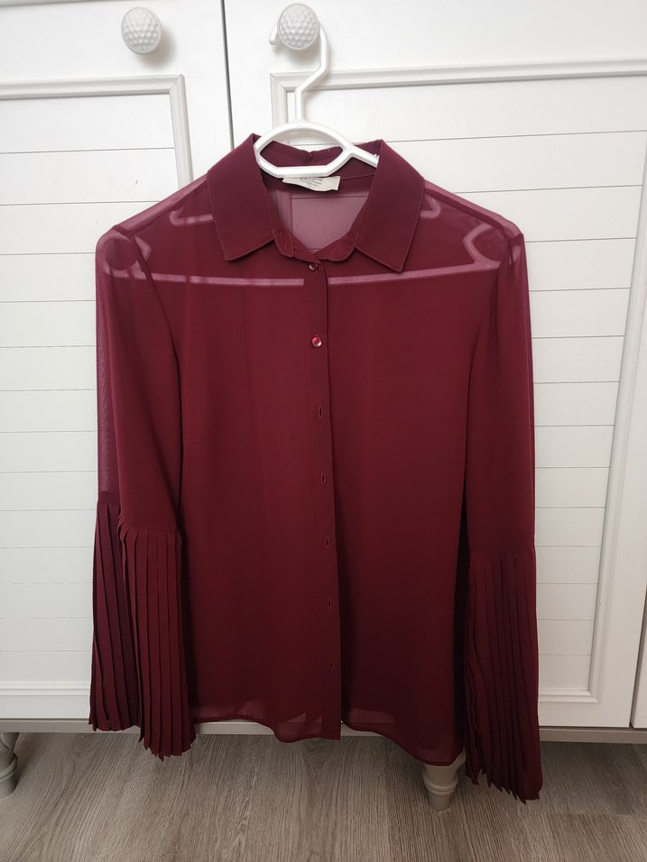 Bordo renkli, uzun kollu ve pilili kollara sahip, yakalı kadın gömlek. İpeksi kumaştan üretilmiş, bol kesim ve modern tarzda, ofis kullanımı için uygun.
