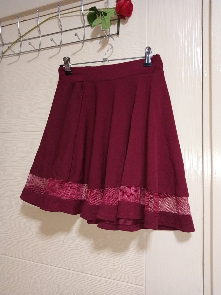 Bordo renkli, pilili ve bol kesim kadın mini etek. Sentetik kumaştan üretilmiş, etek ucu tül detaylıdır. Günlük sokak stili için uygundur.