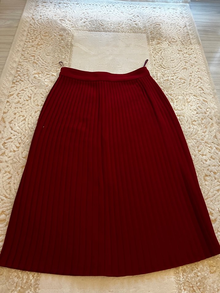 Bordo renkli, pilili ve bol kesim triko etek. Bohem tarzda, Paris esintili ve düğün gibi özel anlar için de uygun.
