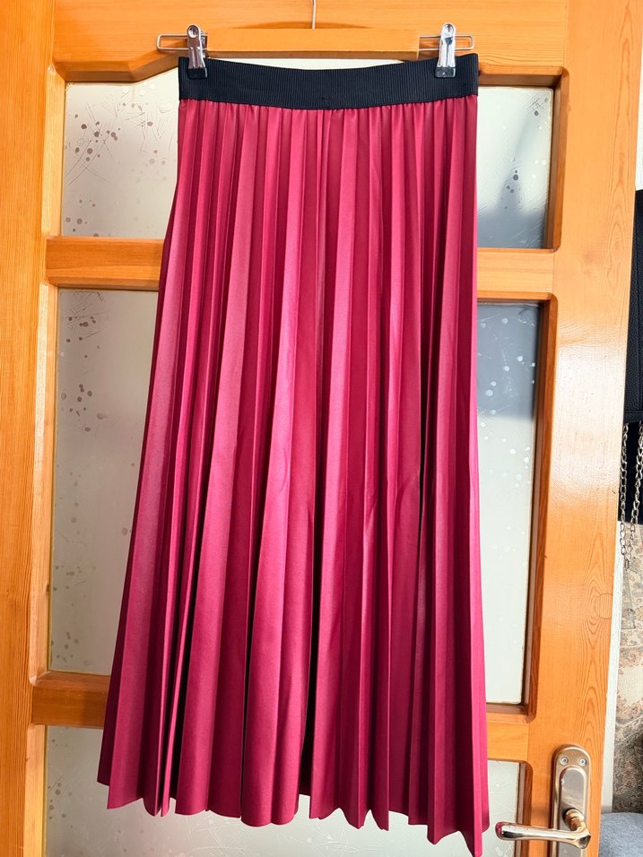 Bordo renkli, parlak sentetik kumaştan yapılmış, pilili ve bol kesim uzun etek. Bağlama desenli, çağdaş tarzda, romantik akşamlar için uygun.
