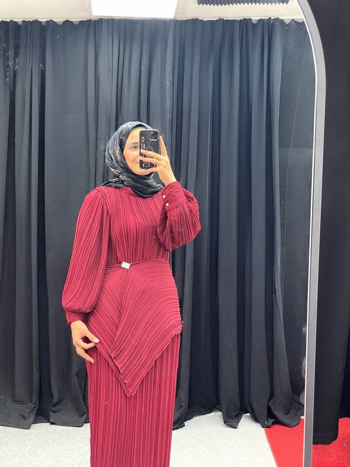 Bordo renkli, uzun, pilili ve yüksek yakalı kadın elbisesi. İpek gibi dokusu, uzun kollu ve rahat kesimiyle günlük kullanıma uygundur.