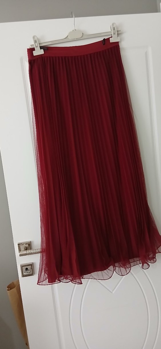 Bordo renkli, pilili ve bol kesim uzun kadın eteği, ipeksi kumaştan olup bohem tarzda, düğünler için uygundur.