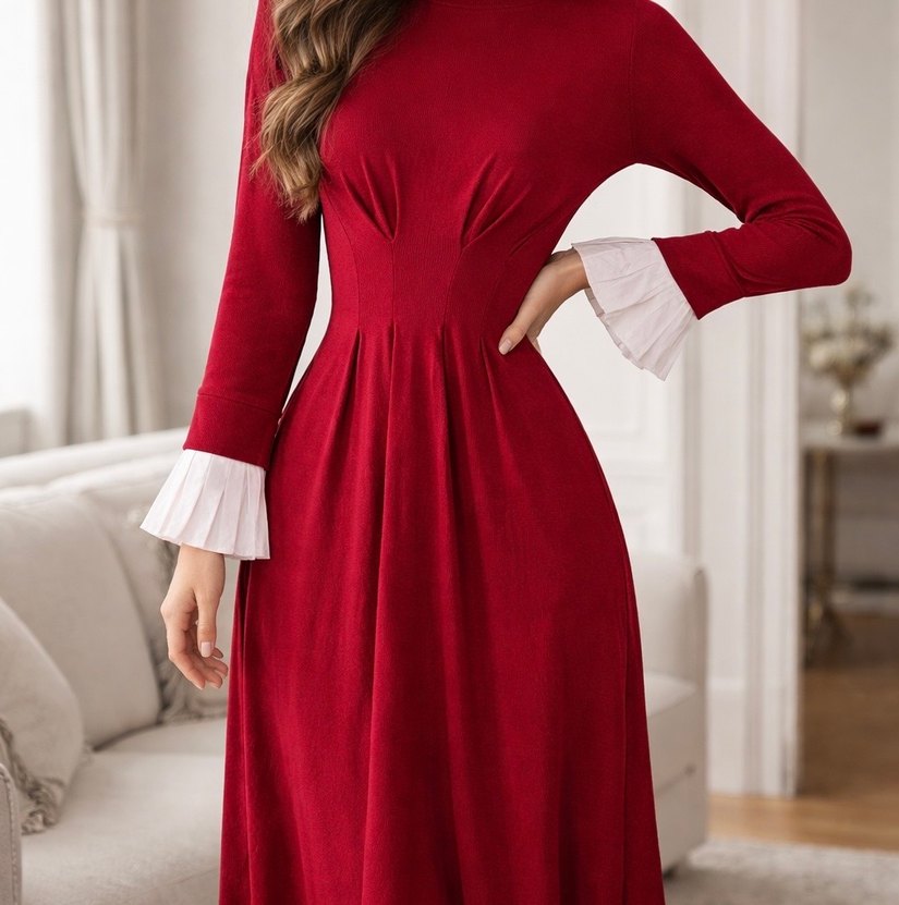 Bordo renkli uzun elbise, V yaka ve pilili beyaz manşetli uzun kollara sahiptir. Düzenli kesim ve parlak, pürüzsüz dokusu ile ofis kullanımı için uygundur.
