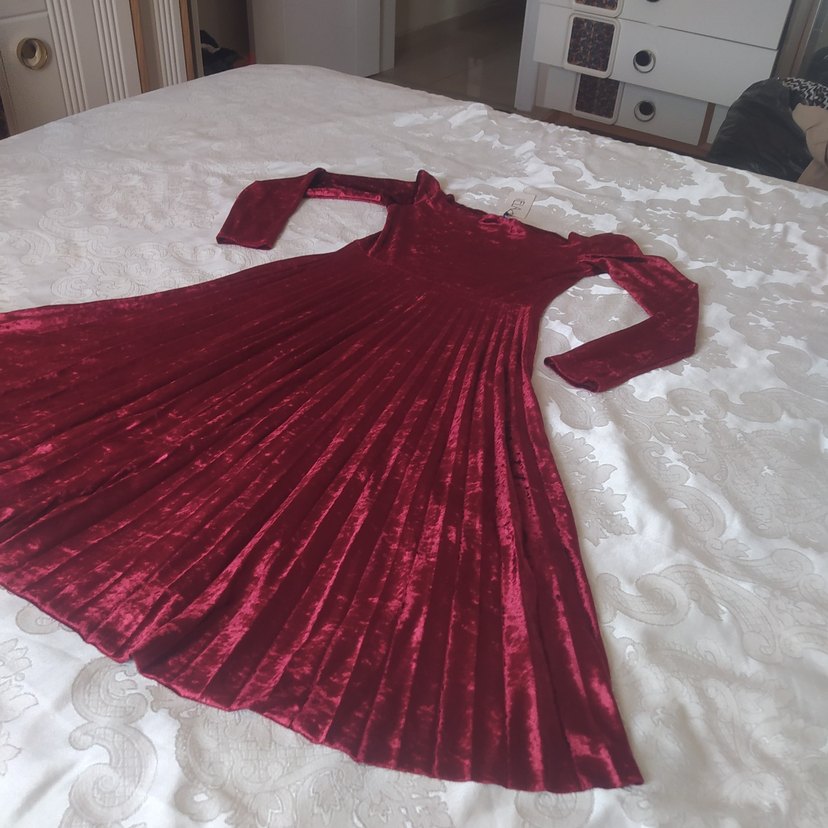 Bordo renkli, uzun kollu ve yüksek yakalı bu pilili abiye elbise, vintage goth tarzını yansıtır. Parlak kumaşı ve uzun kesimiyle parti için uygundur.