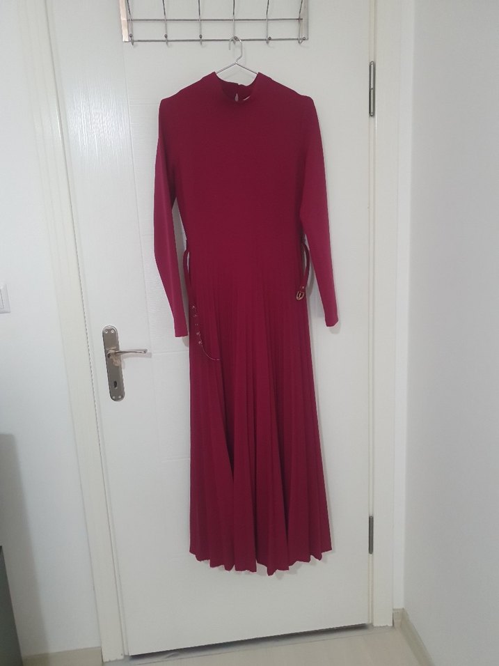 Bordo renkli, yüksek yakalı ve uzun kollu, pilili detaylara sahip, sentetik kumaştan yapılmış, vücuda oturan uzun elbise.