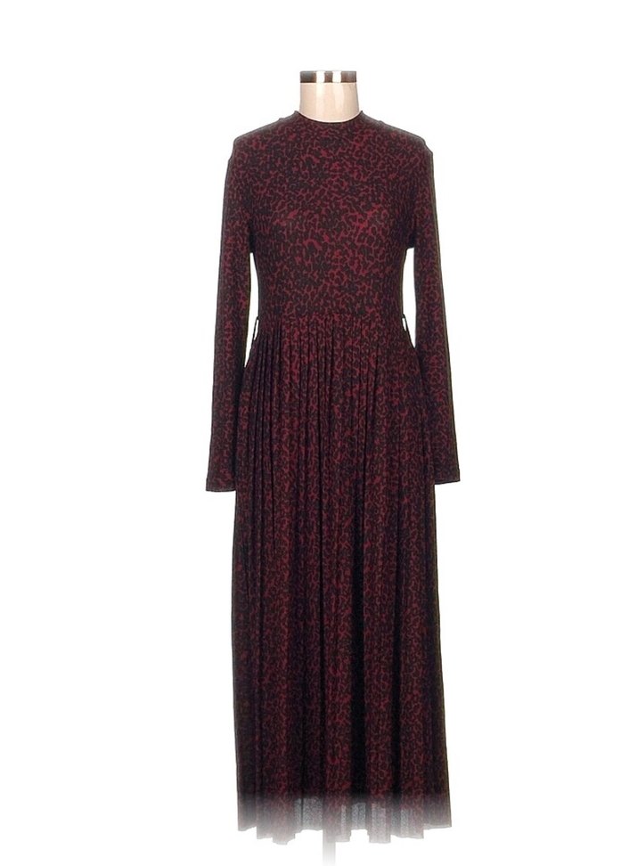 Bordo renkte, yüksek yakalı ve pilili etekli, ince kesim uzun elbise. Yumuşak sentetik kumaştan, vintage goth tarzıyla ofis için uygun.
