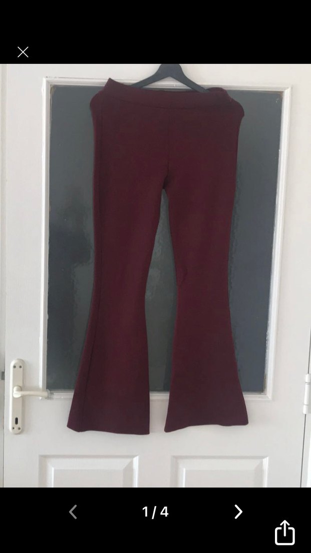 Bordo renkli, ispanyol paça kesime sahip, likralı kumaştan yapılmış, romantik akşamlar için uygun. . Az kullanılmış bir üründür. Boyu 102 cm'dir. Beli lastiklidir.