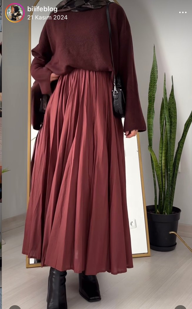 Bordo renkte, piliseli ve bol kesim uzun etek. İpek gibi dokusuyla gündelik kullanıma uygun, minimalist ve sokak tarzı uyumlu.
