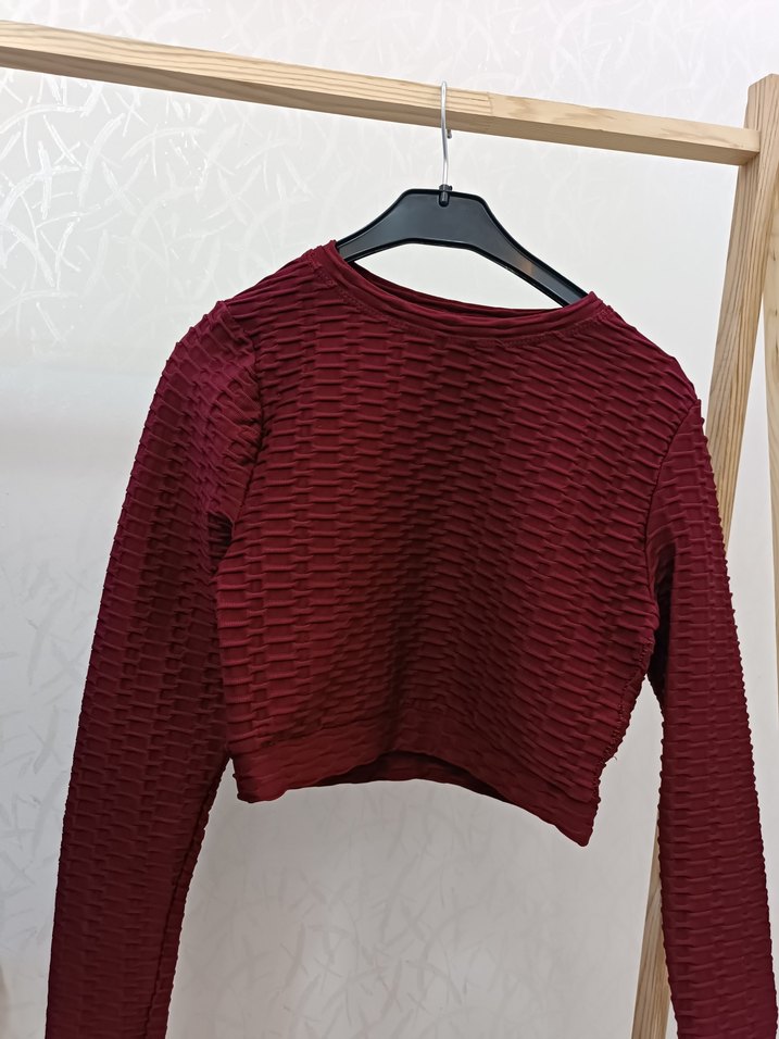 Bordo renkli, piliseli dokulu, kısa kesim ve uzun kollu kadın kazak. Sentetik kumaştan üretilmiş, rahat sokak stili için uygun.