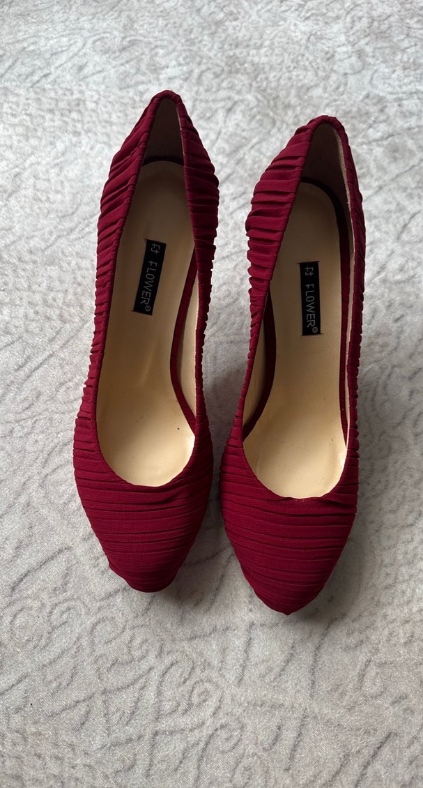 Bordo piliseli, parlak görünümlü stiletto topuklu ayakkabılar. Kauçuk malzemeden, modern klasik tarzda, romantik akşamlar için uygun. Marka: flower 25 10.5