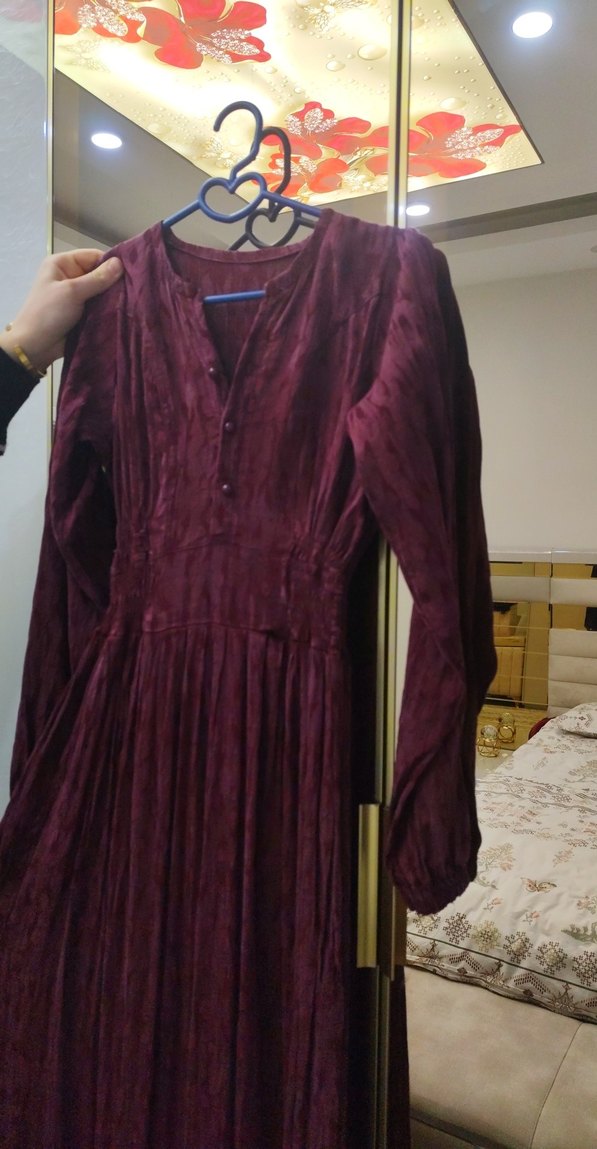 Bordo renkli, piliseli ve bol kesim uzun elbise. İpek gibi dokusu, V yakası ve koyu tonlu batik deseniyle bohem tarzı yansıtır.