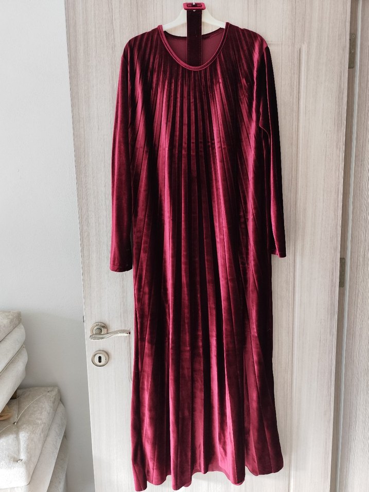 Bordo renkli, uzun ve piliseli kadın elbisesi yüksek yakalı ve uzun kolludur. Rahat kesimi ve düz dokusu günlük kullanıma uygundur, vintage goth tarzındadır kadife kumastir 38-40-42-44 bedene uyumludur kemerlidir