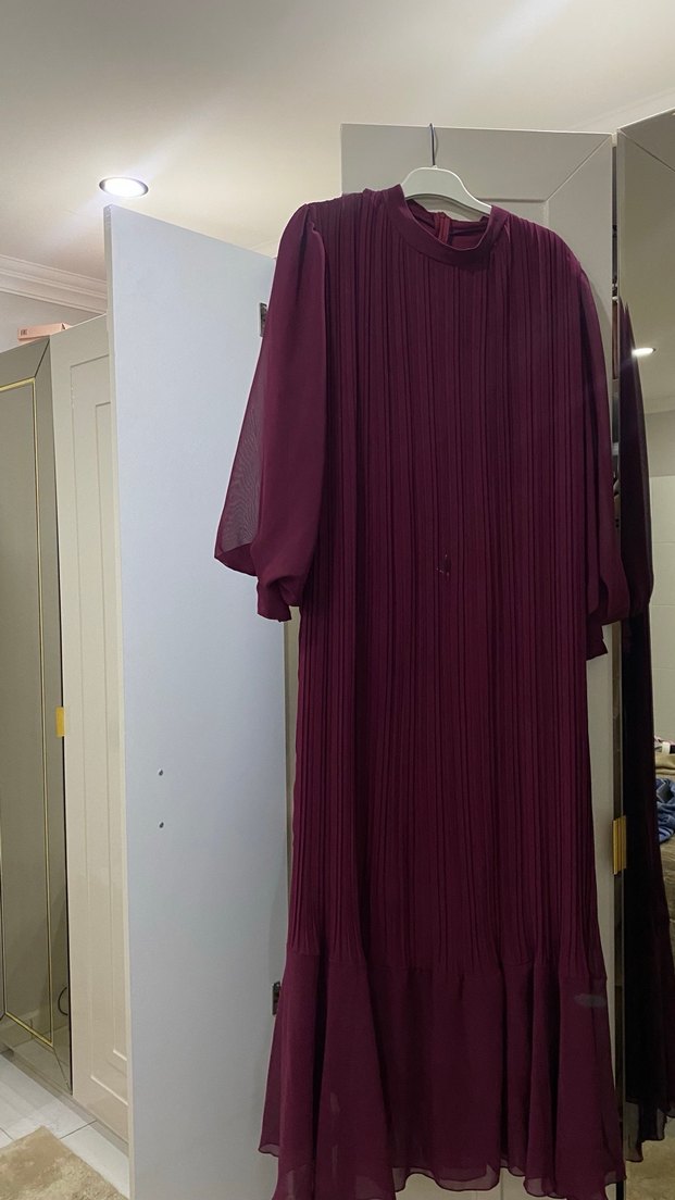 Bordo renkli, piliseli uzun kadın elbisesi yüksek yakalı ve uzun kolludur. Rahat kesimi