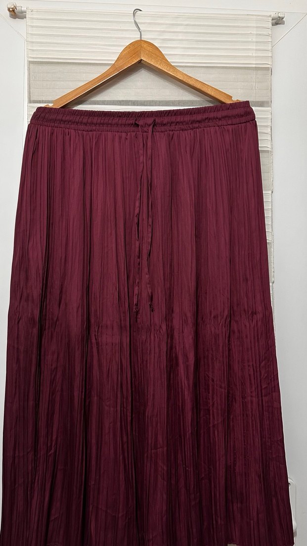 Bordo renkte, piliseli ve bol kesim uzun etek. İpeksi kumaştan üretilmiş olup bohem ve retro tarzlara uygundur. Romantik buluşmalar için ideal.