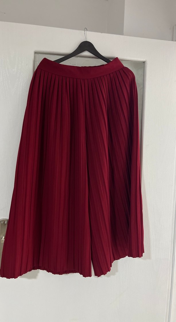 Bordo renkli, piliseli ve bol kesim uzun etek pantolon