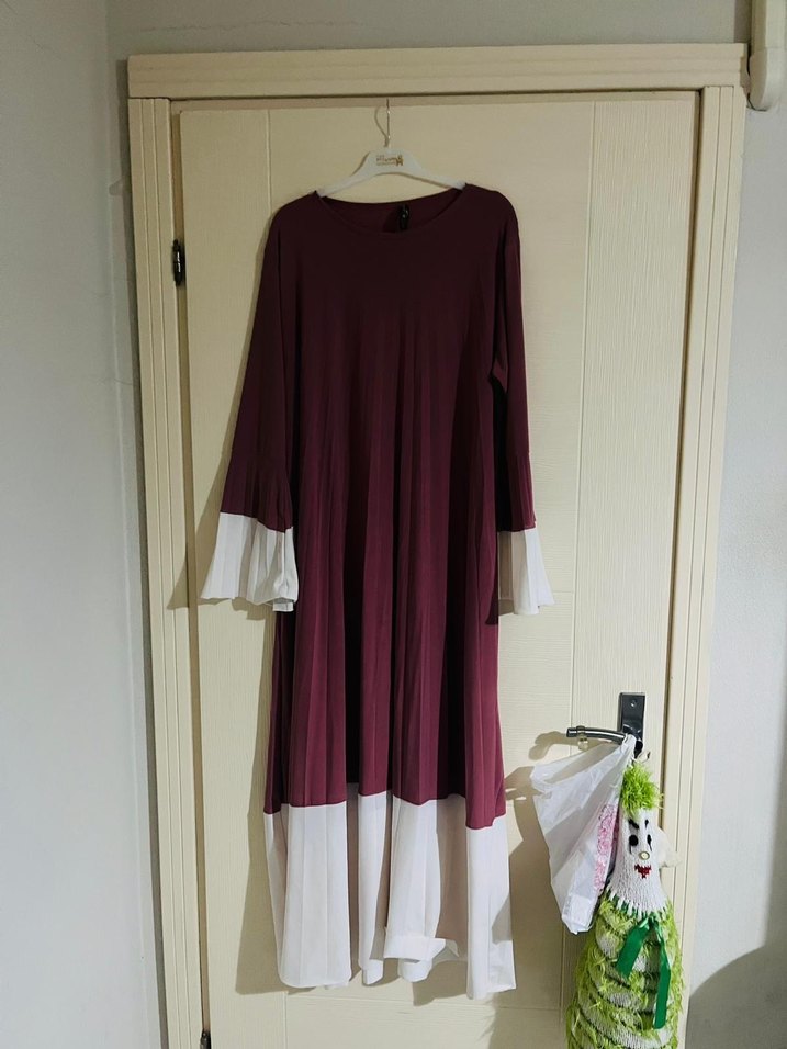 Bordo renkte, piliseli detaylara sahip uzun kollu ve salaş kesim elbisedir. Uçları beyaz detaylı, sade yuvarlak yakalı, günlük kullanıma uygun bohem tarzda bir tasarımdır.