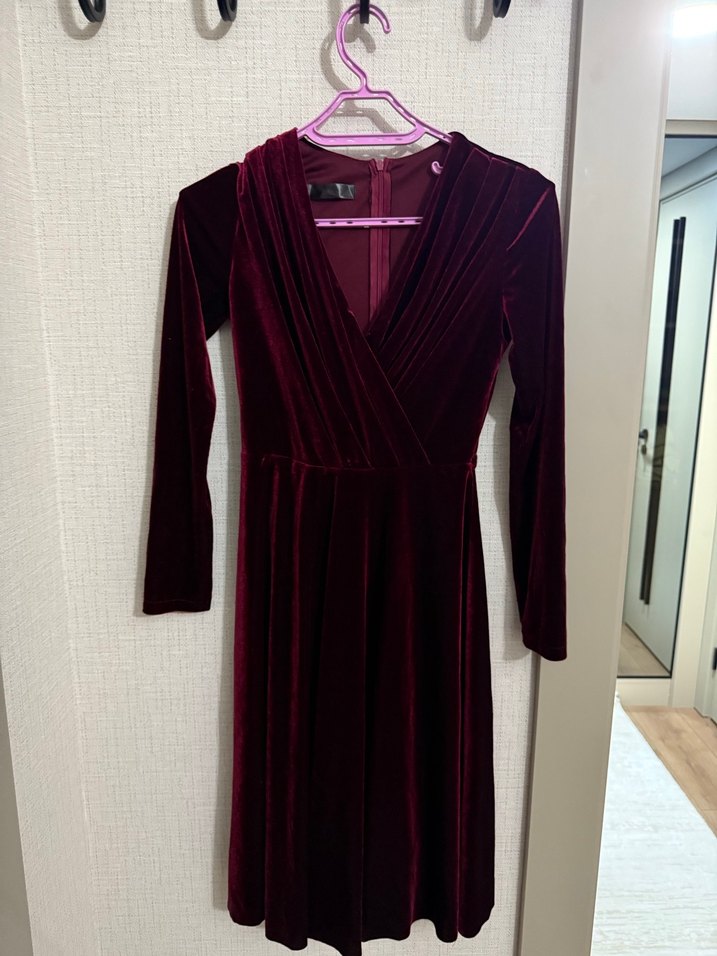 Bordo piliseli V yaka, uzun kollu, klasik kesim midi elbise, romantik akşamlar için uygundur.