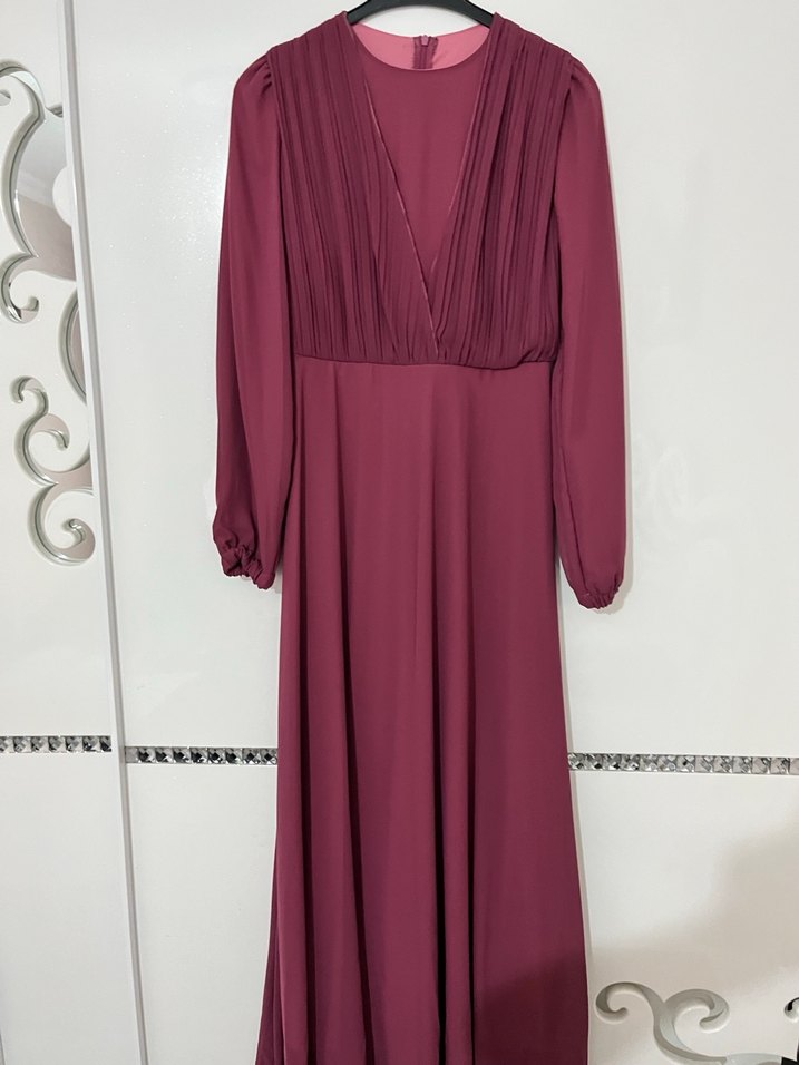 Bordo renkli, piliseli detaylara ve V yakaya sahip uzun elbise. Uzun kollu ve bol kesimli, modern klasik tarzda, ofis kullanımı için uygun, sentetik kumaştan üretilmiştir.