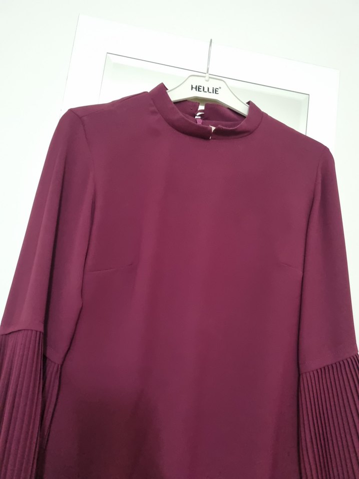 Bordo renk, yüksek yakalı ve piliseli uzun kollu kadın bluz. ipeksi dokuda, ofis için uygun, minimalist ve trend sokak tarzı.