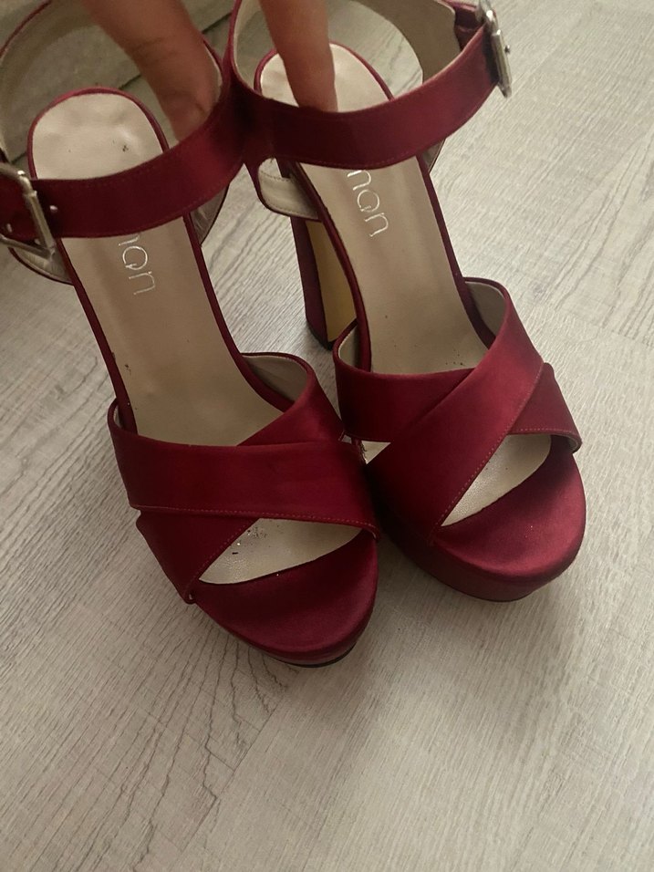 Parlak bordo platform topuklu, tokalı kayışlara sahip, ipeksi malzemeden yapılmış ayakkabılar. Cesur ve gösterişli tarza uygun, romantik akşamlar için idealdir.
