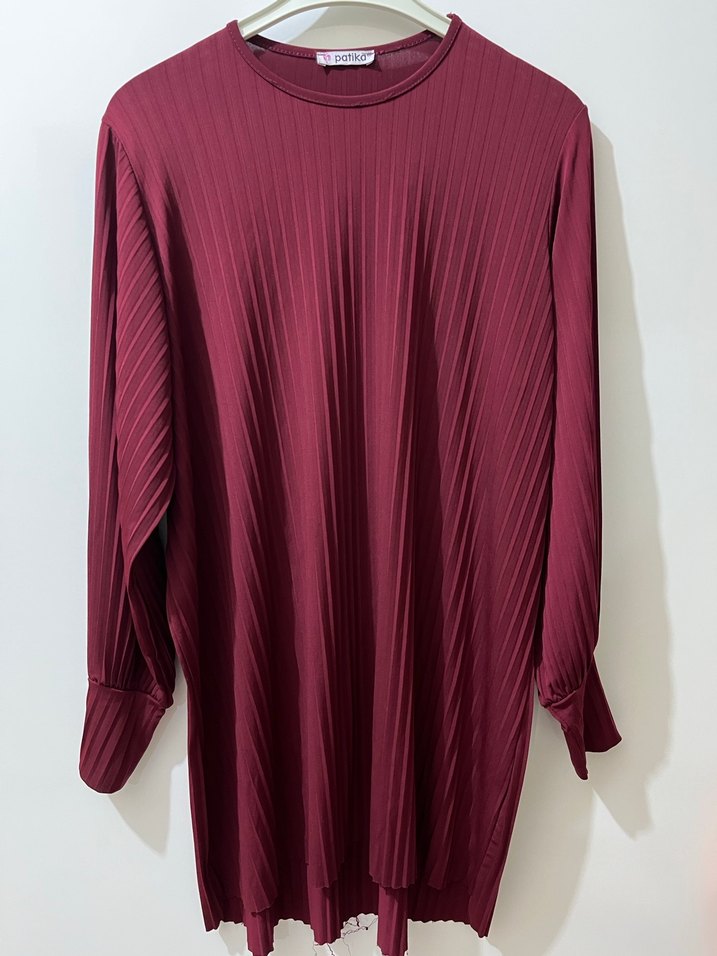 Bordo renkli, uzun kollu ve yuvarlak yakalı kadın tunik. Yumuşak sentetik kumaştan, bol kesim ve uzun boyda, pliseli dokusuyla minimal ve çağdaş tarzda, günlük kullanım için uygundur.