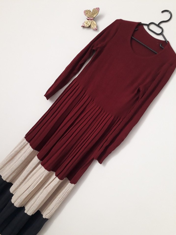 Üç renkte, uzun kollu, yuvarlak yakalı ve bol kesim triko elbise. Pliseli ve renk bloklu alt kısmı ile Paris esintili bohem tarz sunar. Kullanılmıştır. En son fotoda gösterdiğim gibi arkada mercimek tanesi kadar delik var dikebilirsiniz. Ölçüleri fotolarda mevcuttur inceleyebilirsiniz. Standart bedendir. Her bedene olur.
