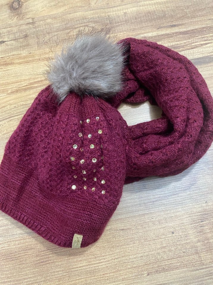 Gri ponpon ve süs taşları detaylı bordo örgü bere, uyumlu örgü atkı ile birlikte. Trendy ve rahat stil için uygun. Çok az kullanıldı