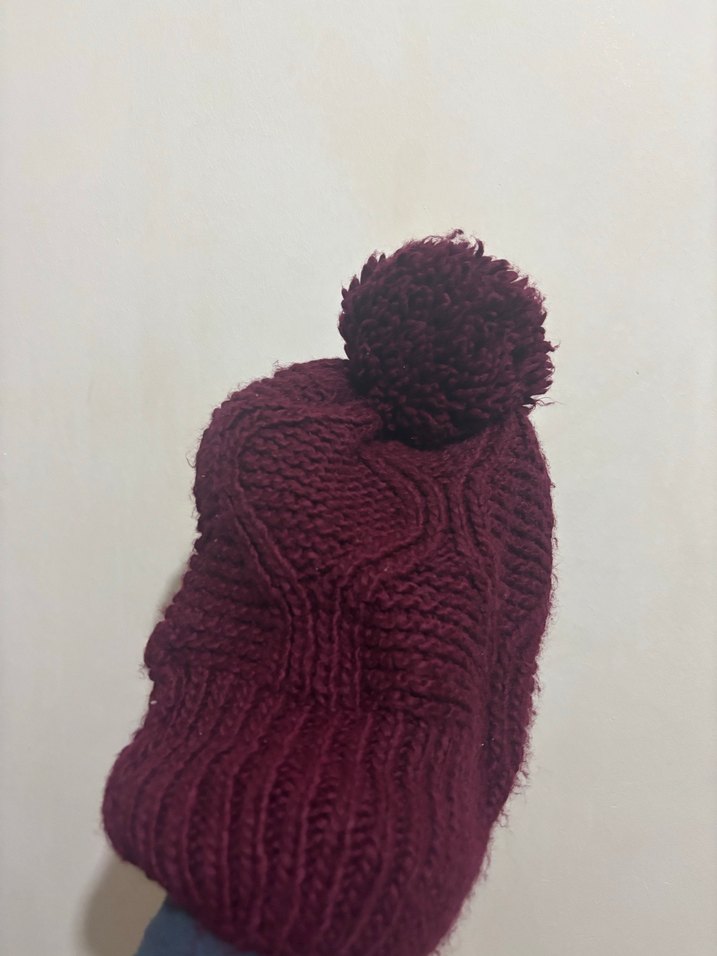 Bordo renkli, örgü yapıda, üstünde ponpon bulunan rahat ve bohem tarzda kadın bere.