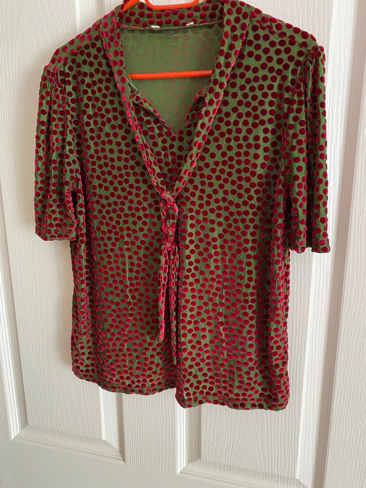 Düğmeli, V yakalı, kısa kollu, bol kesim bordo bluz. Vintage esintili tie-dye deseniyle parti için uygun, yumuşak dokulu kumaştan.