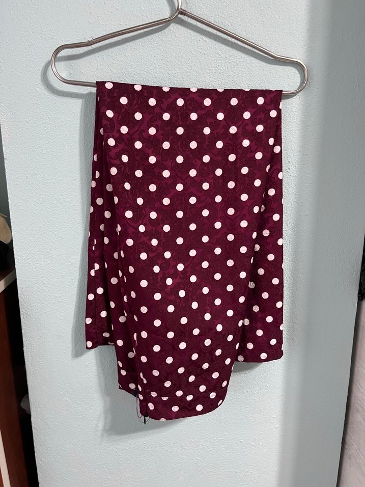 Bordo renkli, puantiyeli ve drapeli detaylara sahip etek. Midi boyda, ince ve satenimsi dokulu, günlük sokak stiline uygun bir modeldir.