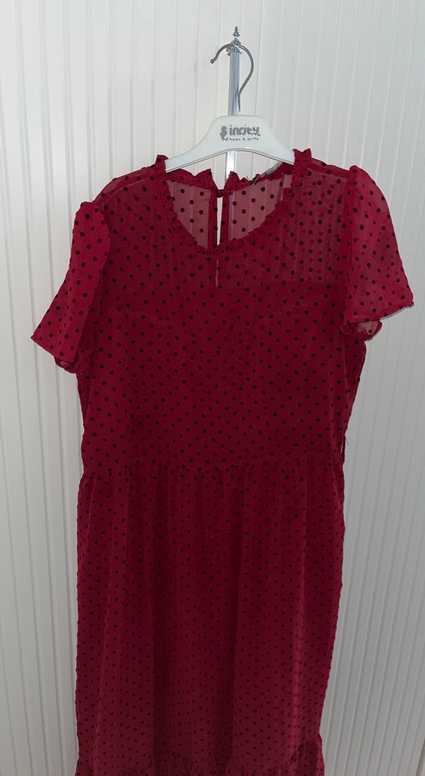 Bordo renkte, kısa kollu ve V yakalı midi elbise. Puantiyeli deseni, fırfır detayları ve bol kesimiyle romantik akşamlar için uygun.